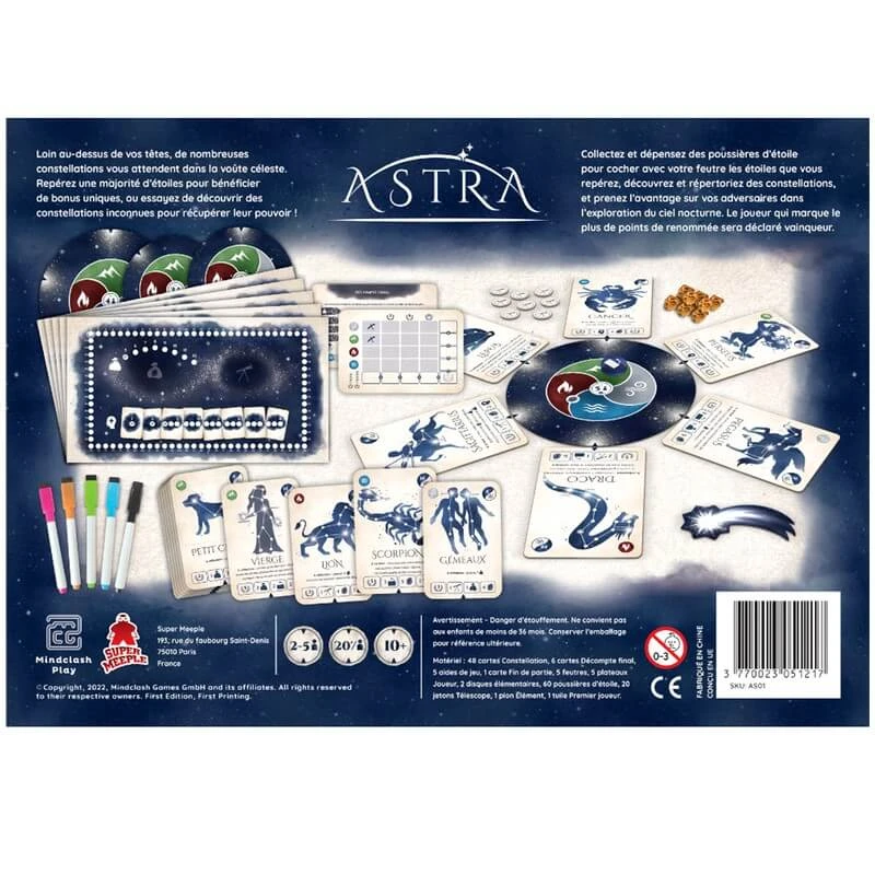 Astra est un savant mélange de tactique et de stratégie, avec un ensemble de règles simplifié et intuitif qui le rend facile à prendre en main et rapide à jouer. Une partie d’Astra consiste en des tours de joueur continus jusqu’à ce qu’un certain nombre de cartes Constellation soient prises, quand, après un pointage de fin de partie, le joueur avec le plus de points de renommée gagne.