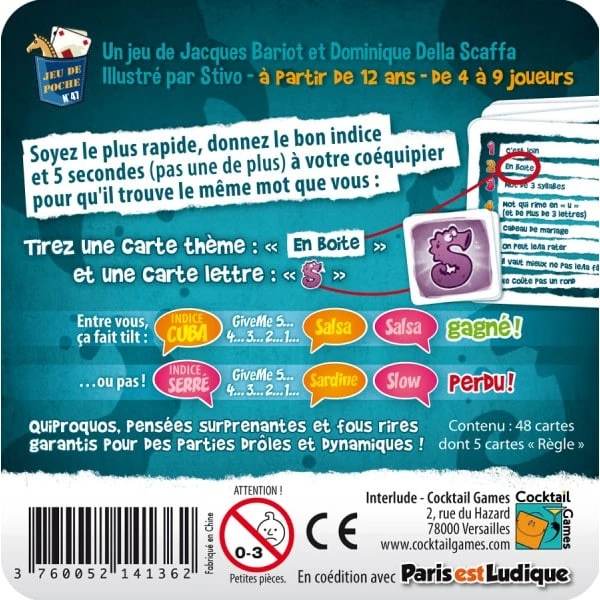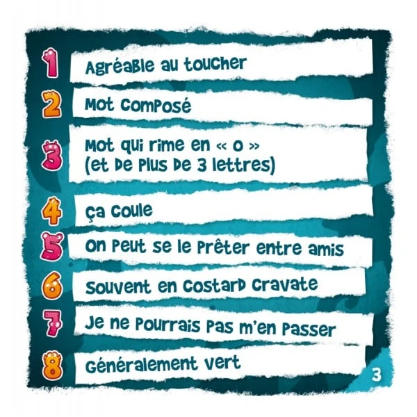 Par exemple : le thème du tour est « ça coule », la lettre imposée « T », et votre indice le mot « rapide ». GIVE ME 5….4…3…2…1… Votre partenaire et vous donnez en choeur la réponse « torrent ». C’est gagné !