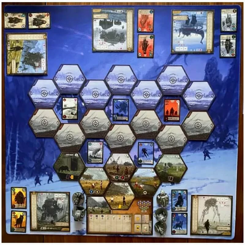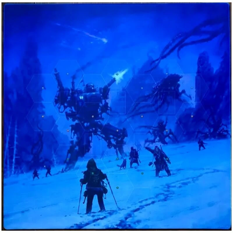 Il est double face (une face avec les contours des hexagones, des cartes et du camp de base et une face avec l’illustration), et il contient les éléments de base nécessaires pour un jeu à 5 joueurs (tuiles de localisation, camp de base et tapis de méchants), avec un positionnement flexible pour différents nombres de joueurs et différentes configurations de table.