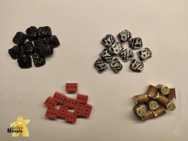 Le Ressources Pack contient: 10 Argiles, 10 Pierres, 10 Charbons et 10 Bois en résine pré-peint pour “Pimper” vos jeux de société