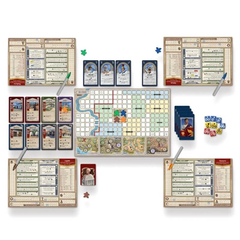 Rome & Roll est un jeu stratégique de type “roll&write” dans lequel vous incarnez un personnage influent, du négociant au chef militaire en passant par le haut fonctionnaire.