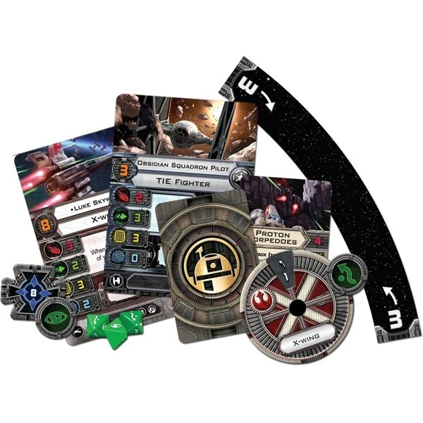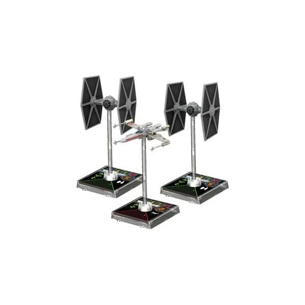 Cette boîte contient tout ce dont deux joueurs ont besoin pour commencer très rapidement une partie de X-wing : des vaisseaux en plastique pré peints, des dés spéciaux, des cartes, des marqueurs et une version simplifiée des règles. Vous y trouverez aussi des règles avancées et des missions spéciales qui donneront une tout autre dimension tactique au jeu.