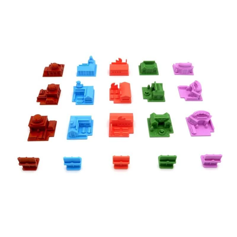 - 15 restaurants (3 rouges, 3 bleues, 3 verts, 3 oranges, 3 roses) (Dimensions: 3.5 x 3.5 x 2.5 cm)